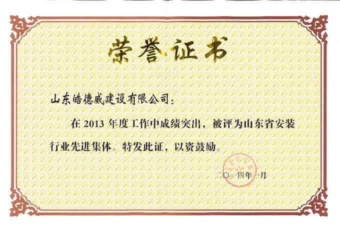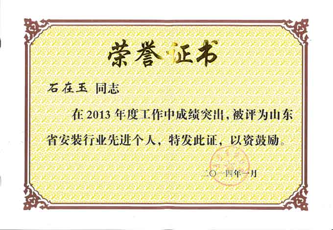 2013年度,公司被山东省安装协会评选为“山东省安装行业先进集体”;公司员工石在玉同志被山东省安装协会评选为“山东省安装行业先进个人”。