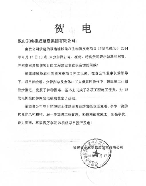 2014年6月17日,福建圣农生物质发电有限公司发来贺电,对我公司施工的管理、进度、质量等给予了充分认可。公司将继续坚持“缔造精品,回报社会”的企业使命,再接再厉,打造更多精品工程。