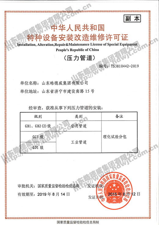 经过集团公司上下的共同努力,2015年压力管道安装许可证换证工作圆满完成!