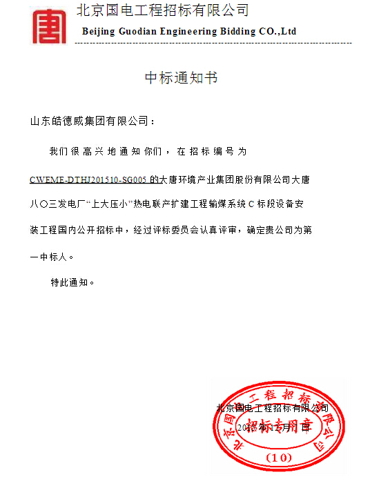 祝贺我公司成功中标大唐环境产业集团股份有限公司大唐八〇三发电厂“上大压小”热电联产扩建工程输煤系统 C 标段设备安装工程!