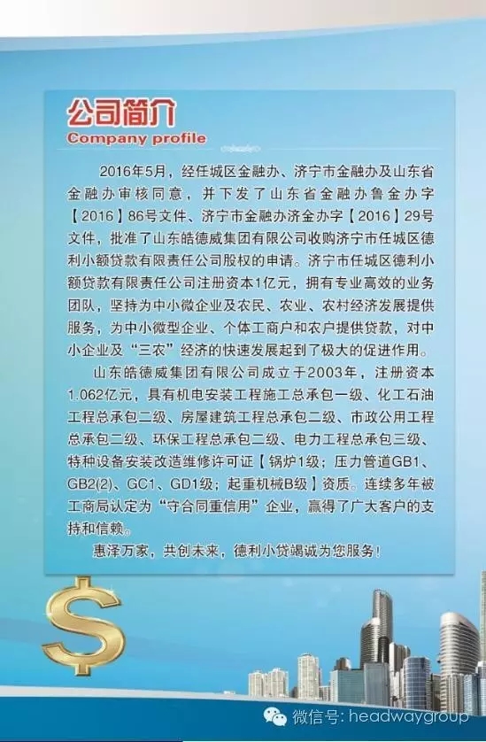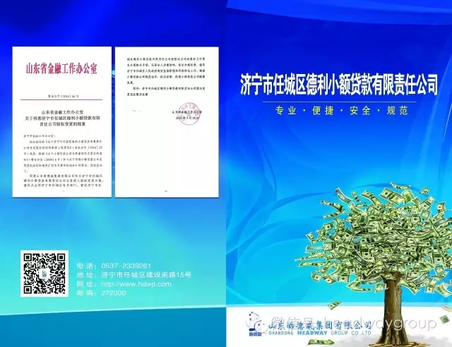 2016年5月,经任城区金融办、济宁市金融办及山东省金融办审核同意,并下发了山东省金融办鲁金办字【2016】86号文件、济宁市金融办济金办字【2016】29号文件,批准了山东皓德威集团有限公司收购济宁市任城区德利小额贷款有限责任公司股权的申请。济宁市任城区德利小额贷款有限责任公司注册资本1亿元,拥有专业高效的业务团队,坚持为中小微企业及农民、农业、农村经济发展提供服务,为中小微型企业、个体工商户和农户提供贷款,对中小企业及“三农”经济的快速发展起到了极大的促进作用。