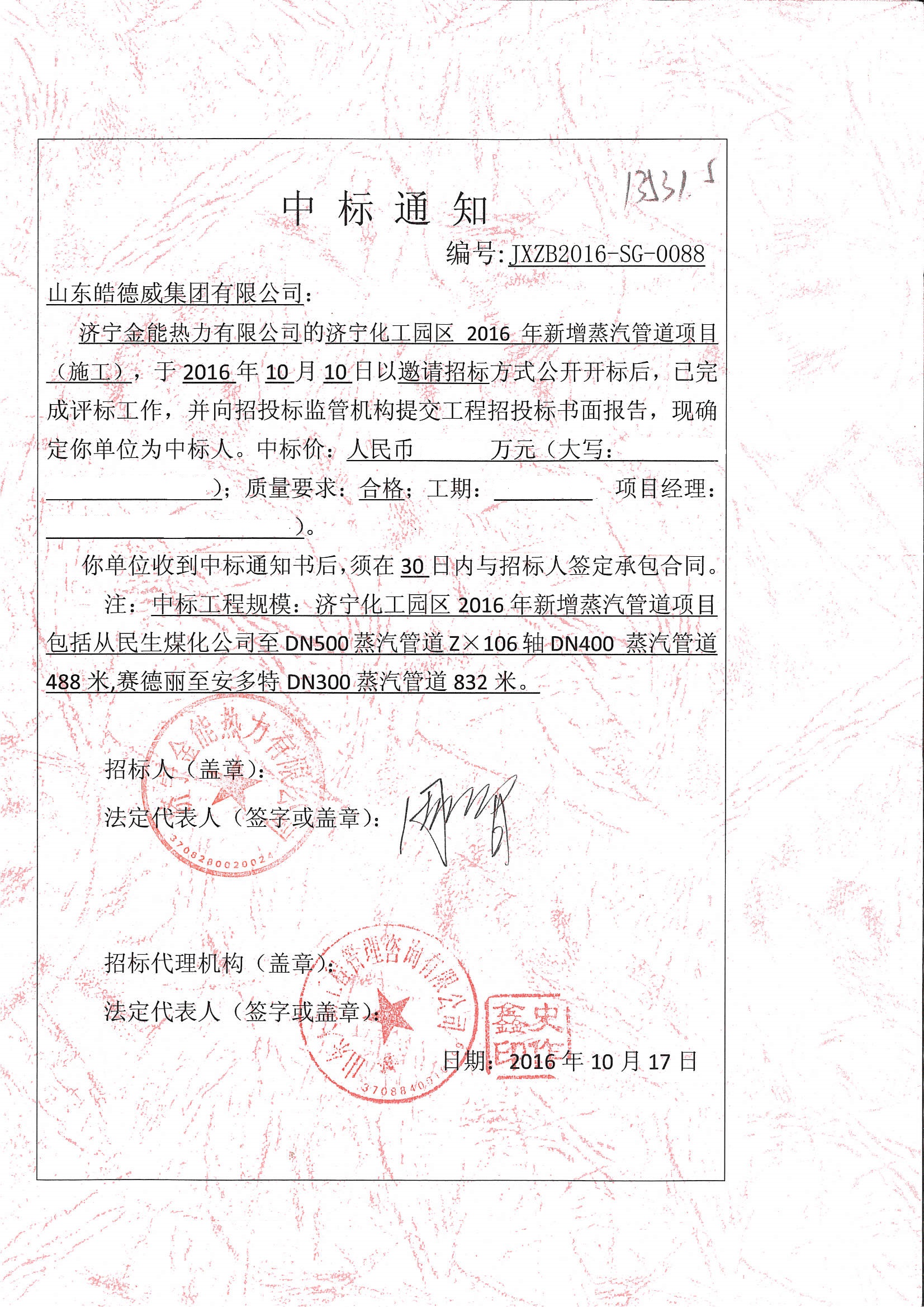 热烈庆祝我公司中标济宁金能热力有限公司的济宁化工园区2016年新增蒸汽管道项目!
